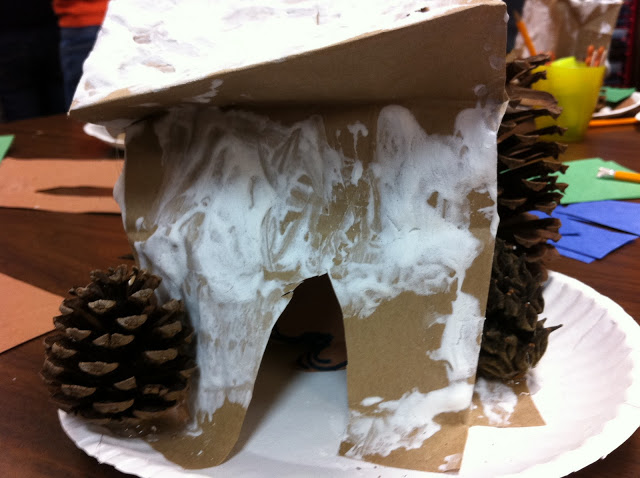 The children added “snow” to the trees and the den. (make snow by filling a dixie cup with shaving cream, add one good squeeze of white paint and one squeeze of glue. Mix with a popsicle stick.)