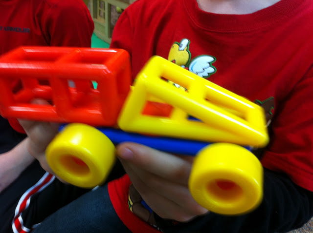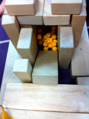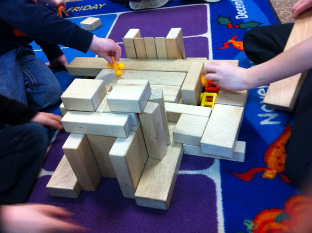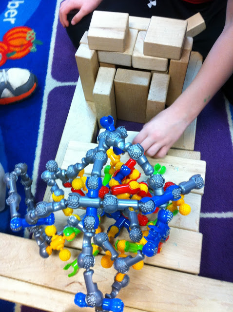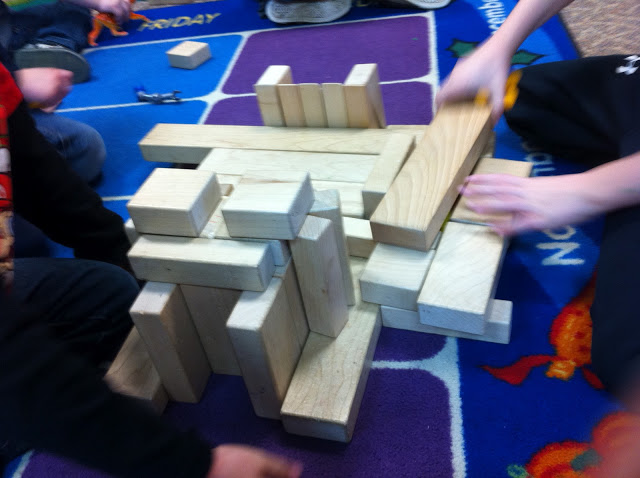 I love to watch little narratives unfold during centers. One of the best places to “catch” such a narrative is in the block center. Here is the saga I captured today: