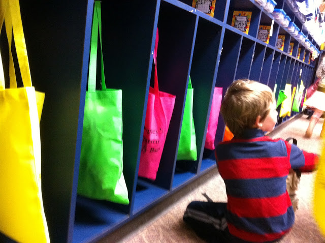 Every year I go to a local book fair at Holland Hall School. I load up on the best stuffed animals and books for a very reasonable price. I use them to make book buddies. This year while piling up my stuffed animals – I had a great idea. Why not buy tote bags and let each child have a book buddy in their cubby for reading time? (Previously, I had sent the book buddies home on a rotating basis.) I went to Oriental Trading and found the best deal on personalized totes!