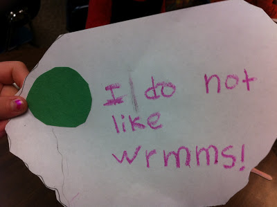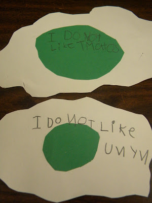 One of my colleagues, Amber Hatch, (who is a talented curriculum designer) came up with the best idea. (And it is super easy!) The children made their own “green” egg. Each child wrote “I do not like. . .” and a food they do not like using kid-writing. Love this project!