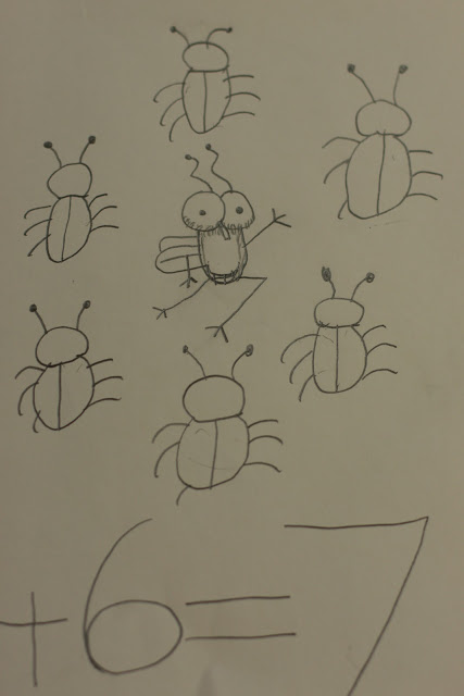 This is a fun activity for math. First, I taught the children how to draw Fly Guy. He is a very simple figure to draw. Next, I had the children draw bugs with Fly Guy. They had to write a math sentence to go with their drawing. The room was a peaceful quiet as they joyfully created Fly Guy.