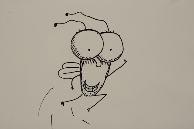 Step Ten: Now for the most important step! You will add what artists call “hatching”. It is those straight lines along the edges of the eyes (see above) and around the body. Add a few on the top of the eyes. Ta Da! Fly Guy!