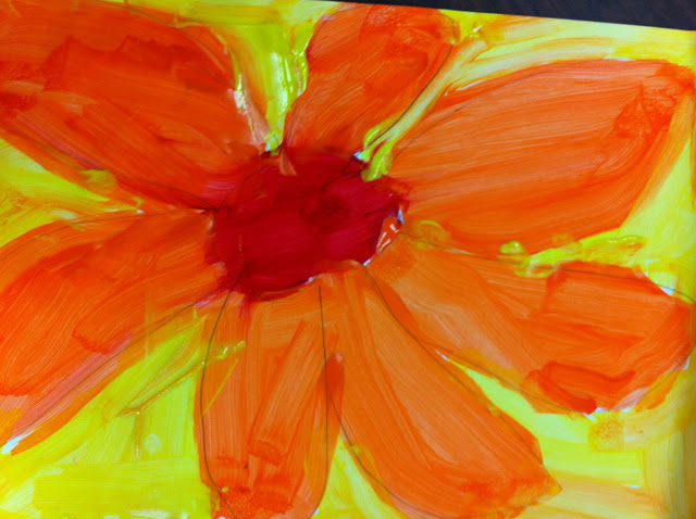 One of the last big projects I did with the children this year was a flower study. We looked at the work of Georgia O'Keefe and how she painted her flowers to fill the entire canvas. We noted three things that Georgia O'Keefe did: