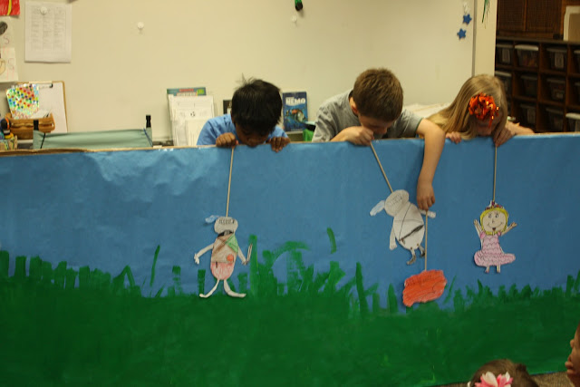 The puppet stage was made from a refrigerator box folded to make a tent-shape. I stapled on bulletin board paper and let the children paint grass.