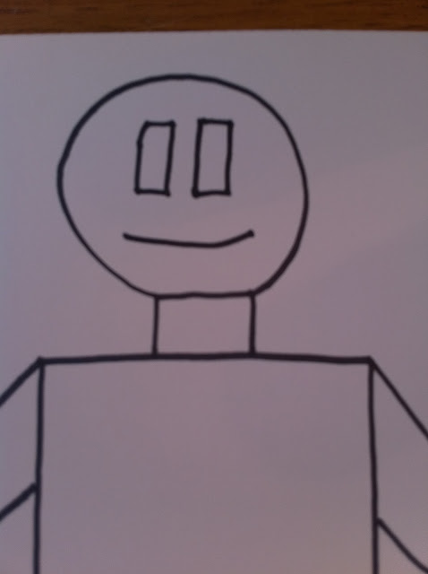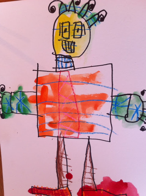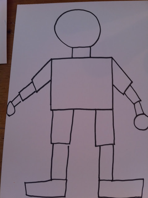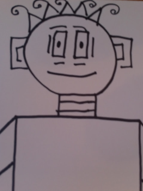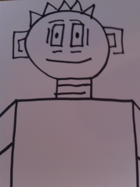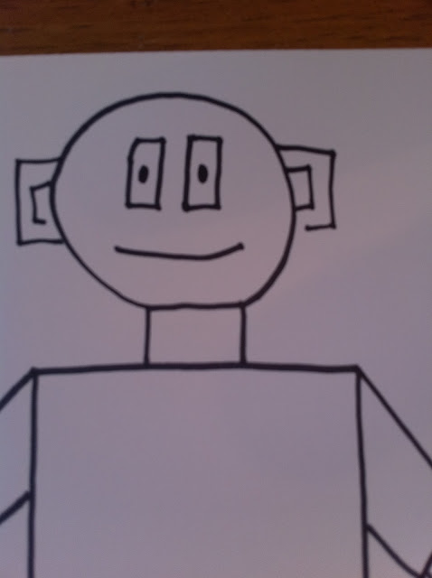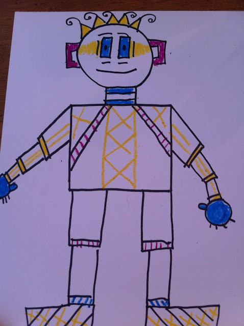 I use sharpies and crayons for this project. I lead the children in drawing the robot in a “I draw – you draw” format. I let the children have total freedom in choosing colors and how to decorate the robot.