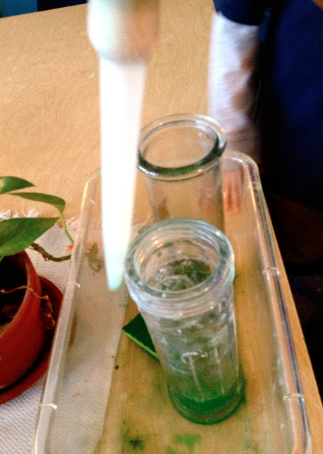 Turkey baster to squeeze colored water from one container to another.