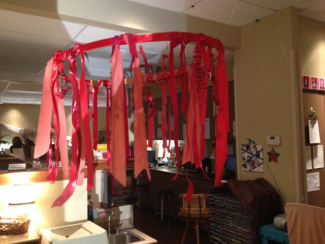 Collection of red ribbons and beads on a hanging wooden hoop.