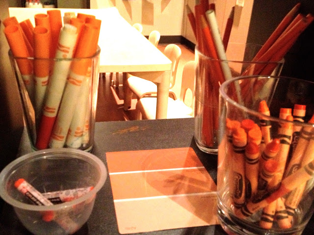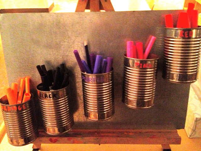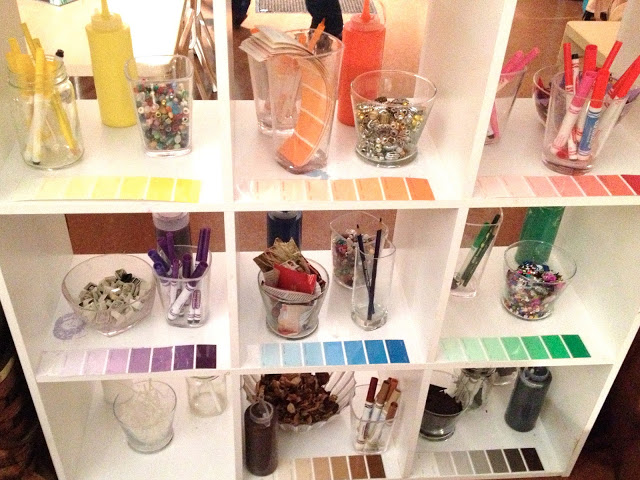 Here is a close-up of one where the paint chip was placed in the middle of the shelving unit. I love the inclusion of oil pastels and colored pencils.