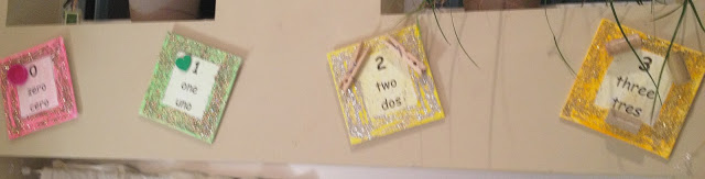 Canvas board number frieze with real objects showing quantity. And, of course, the glitter!