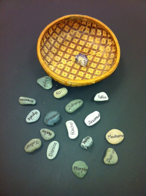 On the first day of school, Andrea reads the book “Everybody Has a Rock.” Each child blindly selects a pebble from the basket (she collected these from the Pacific Ocean).