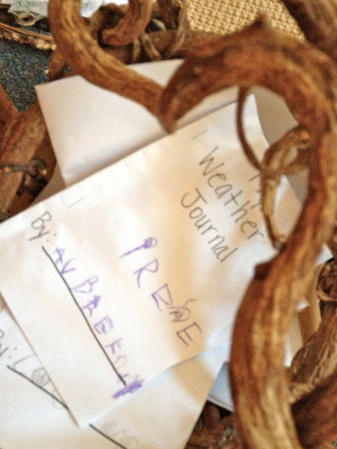 Writing samples hanging in a window related their weather study (which came out of the air inquiry).