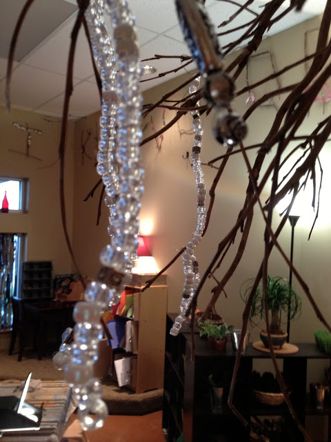 I found the best times to work on the chandelier with the children was during arrival and after nap. It is a perfect activity for soft and gentle moments. Stringing beads is a lovely way to sit and talk.