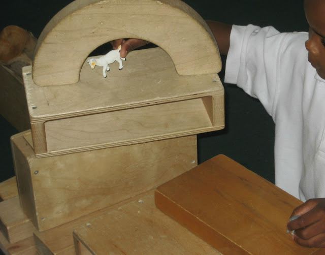 One of the folders had photos of Three Billy Goats Gruff “puppet” play in blocks. I had made two simple Waldorf style troll “marionettes” out of fabric and provided a variety of toy goats. I read the story every day for a week before putting these props in blocks. I also retold the story using these props to model how to tell a story.