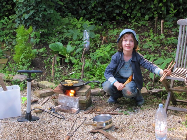 He found old bricks in the basement, mixed up his own mortar from mud & sand & came up with the design all on his own. The best part of the whole project is that it works ! He even cooked crepes one Sunday morning for us. He is proud of it (although he still mutters under his breath because we won't let him light it…maybe this summer he'll be old enough…)