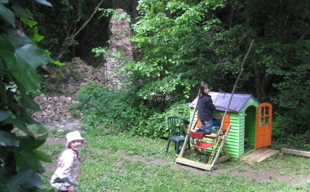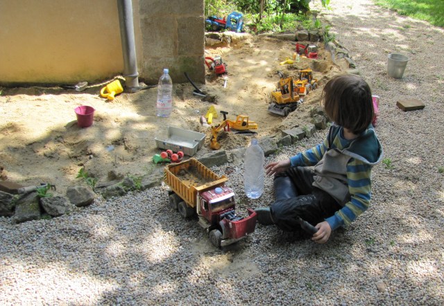 Today, let's go out into our yard. Everybody knows how good it is for children to spend time in nature. Of course, there are the main benefits – like fresh air, sunshine, exercise – but there are also benefits that aren't mentioned quite so often. The sense of accomplishment after some (self-imposed) hard labour or the sense of freedom while yelling at the top of your lungs or the sense of excitement when hiding in the bushes during an extended game of hide and seek (or “cache-cache” as it's called in French).