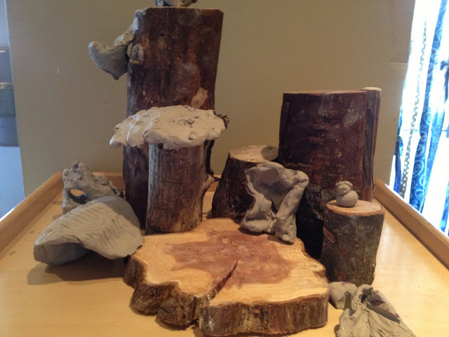 Pieces of clay were placed in the log “forest” as one child called it. The piece with the hole in this photo was created for “lady bugs to crawl through.”