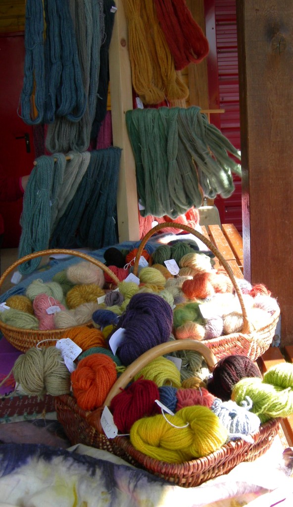 Look at those vibrant shades ! These skeins were spun by the lady who dyed them with plants that she had grown & harvested. They included wool, mohair, silk & samoyed (yes, dog fur).