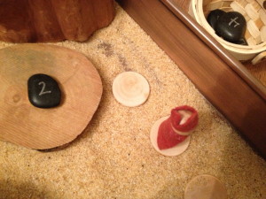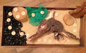 I let the children create the landscape and then put down the wood disc pathway.