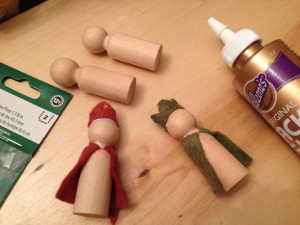 Step One: Cut a rectangle of felt out for the cape. I place the wood piece on top of the felt and cut it just a tad shorter and long enough to just cover the piece.