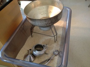 I love love love putting weird and wonderful things in my sensory table. This is an old farm milk strainer. I set it in the wire holder of an antique apple strainer. It worked perfectly.