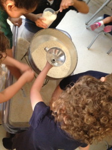 Scooping, pouring and watching the rice fall to the ground. . . .