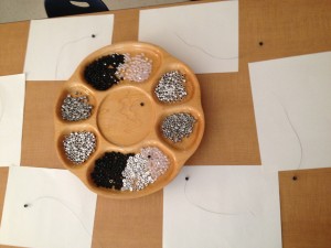 I like to set up the Bead & Wire Center with a mat at each spot. I prepare the wires by placing a bead at the end of the wire (see photo below). I place one at each spot. It is like an invitation. I found a great wooden turntable for the beads.