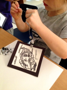 I poked the children's self-portrait on to the wire. Next, each child filled their wire with beads.