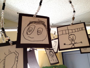 Unfortunately, I did not take pictures of the self-portrait process. The children drew their self-portraits with pencils. We traced the drawings with a sharpie. Then, the self-portraits were mounted on black paper. (Finished size is about 5″ x 5″).