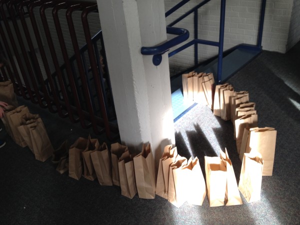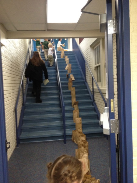 There were challenges. The paper bags fell over very easily. Teams of children had to work together to repair places the wall tumbled. In the end – a running wall was built from within the classroom to the next level of the school. It was exciting and easy to remove!