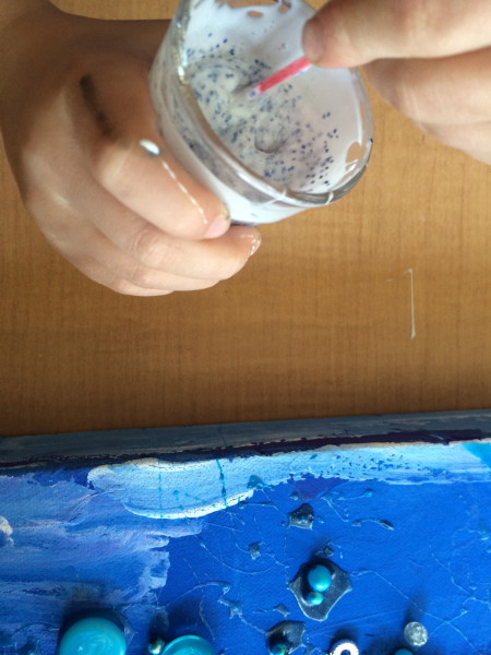 The glitter mixtures were poured on to the canvas with craft sticks.