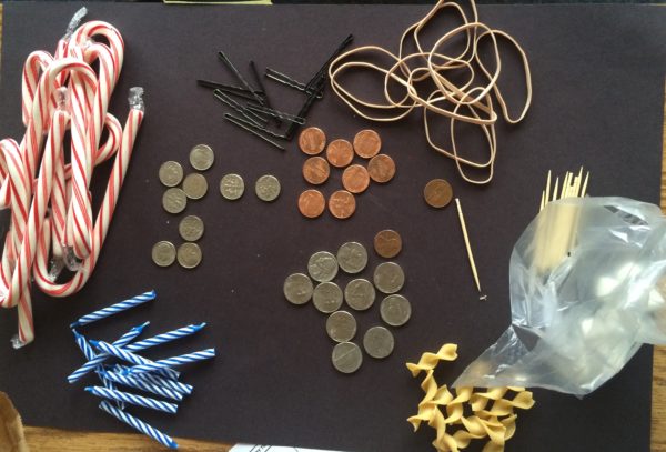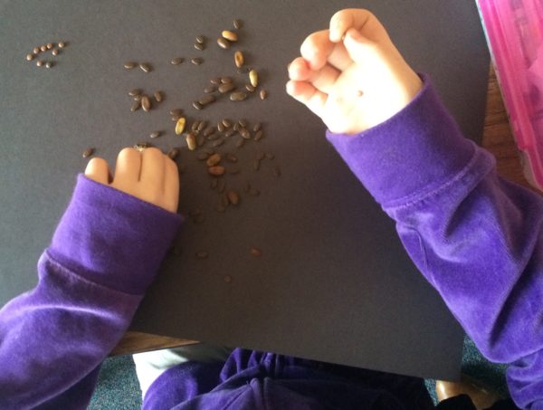 We began the day with the “collection of 100” each student brought to school. I put out a large black construction paper for each student to display their collection. I like using black as it really showcases the collection. I used to have the children glue down their collections in groups of ten. But now I find it more interesting to see how the displays vary child to child – grouped by object, sorted by size and color. They spent a lot of time setting up their display. I tell them it is a “Museum of 100 Collections.”