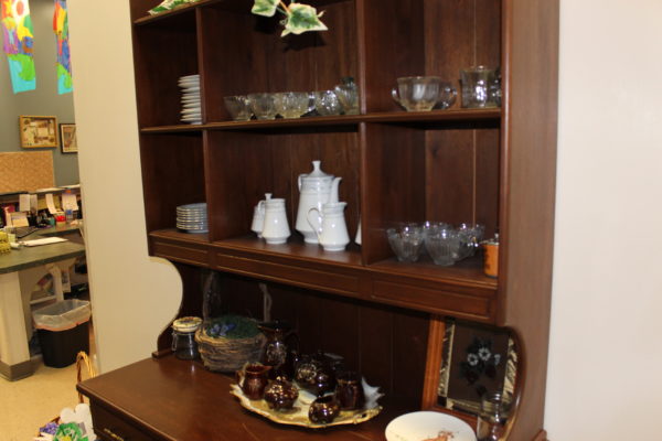 This is a cozy little nook in the corner of the gathering area. Inside the cabinets are place settings and other decorations that the children may come to get if they want to have a “fancy” lunch while they are dining family style in their classrooms.