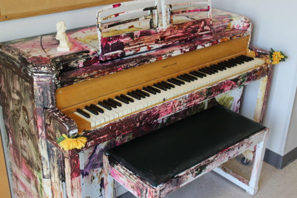 This is a piano that the children painted at one of their art celebration days. This piano is in the music common area so the children may use it at music time.