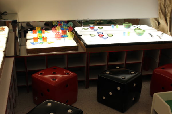 Another picture of the light and shadow room. The light tables here are just old ballasts that they did not want to throw away so they re-purposed them. Brilliant!