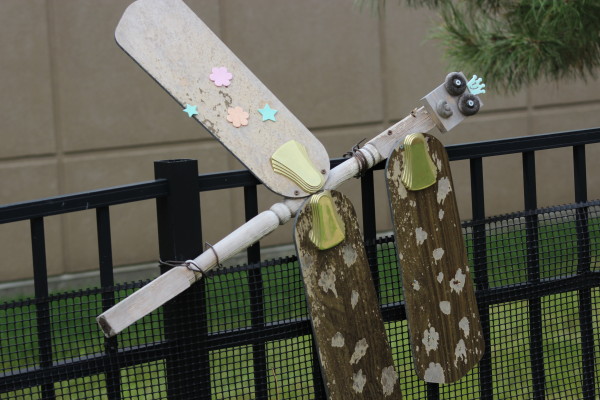 These adorable dragonflies adorn the garden area. They are of course created out of old ceiling fan blades and banisters. This little fella has lost his wing, but I thought it was such a great idea I decided to share.