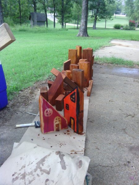 Some of the scrap pieces were already shaped into these nifty house looking forms so I used acrylic paint to paint the “houses” and then clear coated over the dry paint.