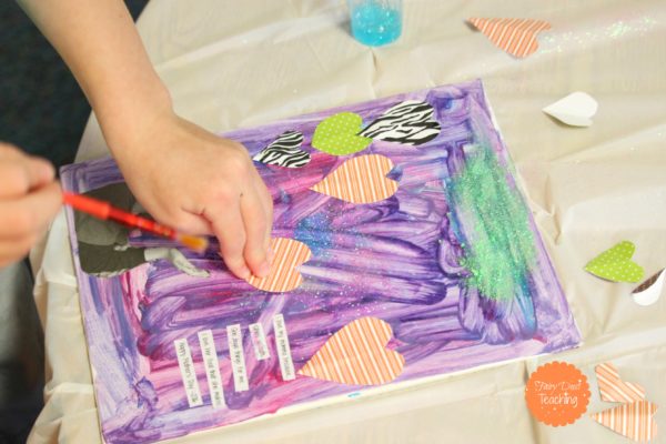 I read the book, “I Love You, Stinky Face” by Lisa McCourt. This book is all about a momma who loves her child so much she would do anything for him no matter if he was a dinosaur, an alligator, or a smelly skunk. It is really cute and the kids laugh and laugh at each page. More important to the project, however, is at one part in the book the momma blows a kiss to her son and it shows hearts being blown at him with sparkly stars in the background (the glitter!).