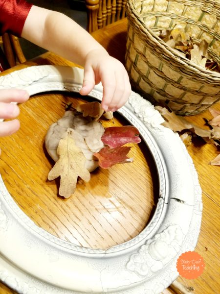 while the little one worked hard pressing leaves into his Playdough. He's building his fine motor and hand/eye coordination!