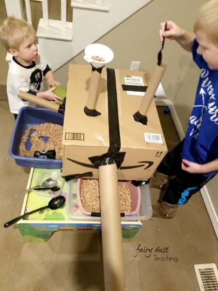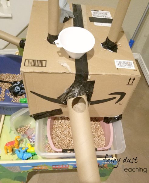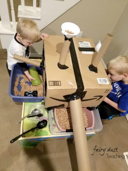 This was intended as a birthday gift for the toddler, but as you can see, the 6 year old was just as fascinated with it. They scooped and poured and searched for where their beans were ending up.